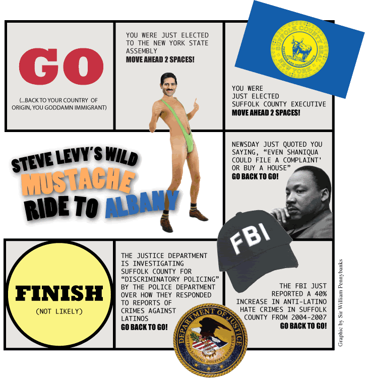 This won't please notoriously "image-conscious" gubernatorial candidate Steve Levy. Observer reporter Azi Paybarah tweeted a link to this mock board game, which puts the face of the Suffolk County executive and recently-declared Republican candidate on Borat's scantily-clad body. The game—dubbed "Steve Levy's Wild Mustache Ride To Albany"—evokes allegations of anti-Latino policing under Levy's watch, and references a controversial quote in which he said an anti-bias housing law would make it so that "[e]ven Shaniqua could file a complaint." Levy isn't the first gubernatorial hopeful to get mocked this election season. Attorney General Andrew Cuomo still hasn't officially declared his candidacy, but the Democrat has already been the subject of a fairy tale-themed attack ad.