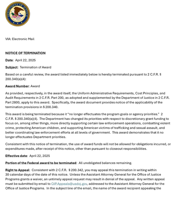 The same month Bondi announced the cuts, affected organizations received an email stating the DOJ had “changed its priorities” for discretionary grants to focus more on “law enforcement operations” and “combatting violent crime,” according to a copy obtained by Gothamist.